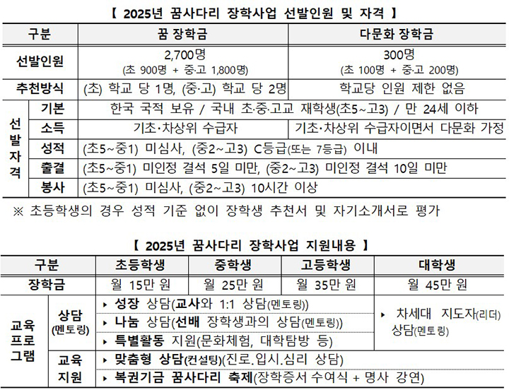 꿈사다리 장학금은 두 가지 유형으로 운영돼요. 하나는 일반 저소득층 학생을 위한 '꿈 장학금', 다른 하나는 다문화 가정 학생을 위한 '다문화 장학금'이에요. 올해는 꿈 장학금 2,700명, 다문화 장학금 300명을 선발할 예정이에요.
