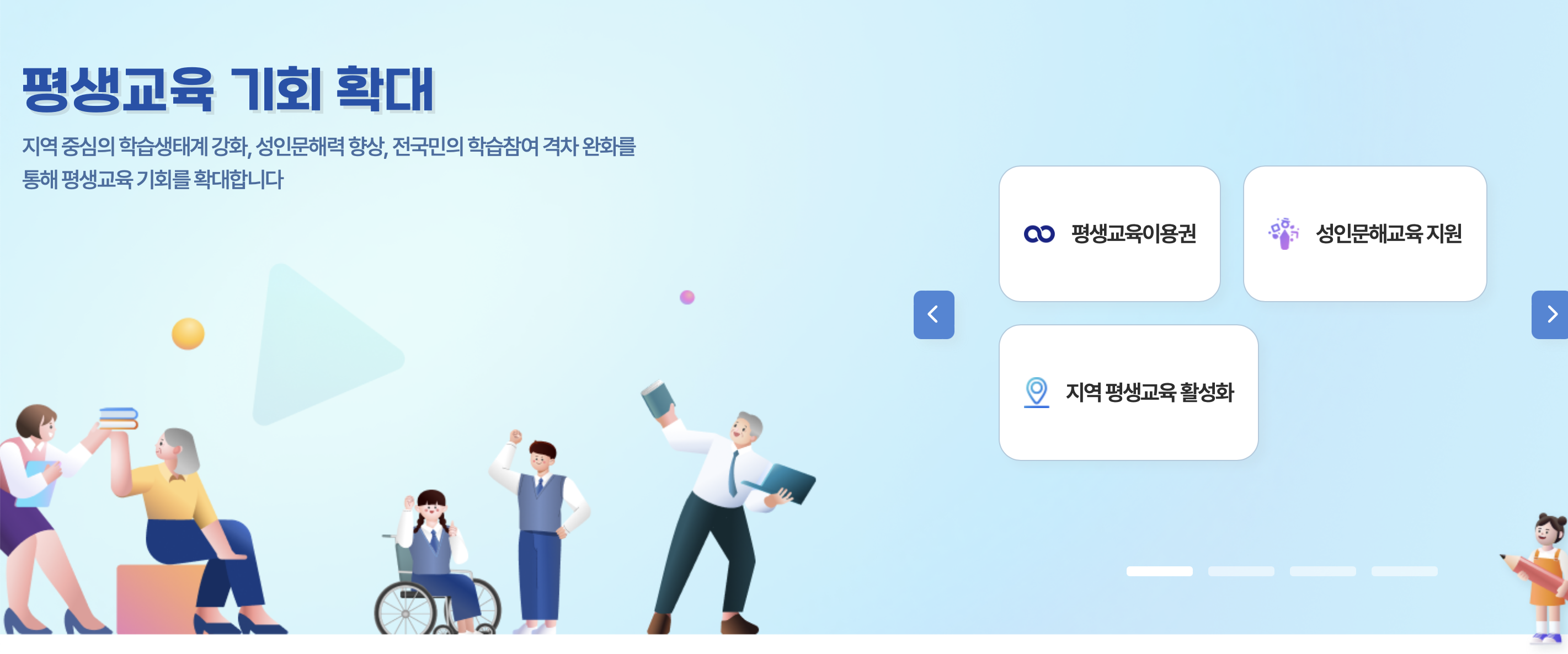 사회·경제적 여건에 따라 평생교육 참여가 어려웠던 저소득층, 장애인, 노인 등 취약계층에게 실질적인 학습 기회를 제공합니다.